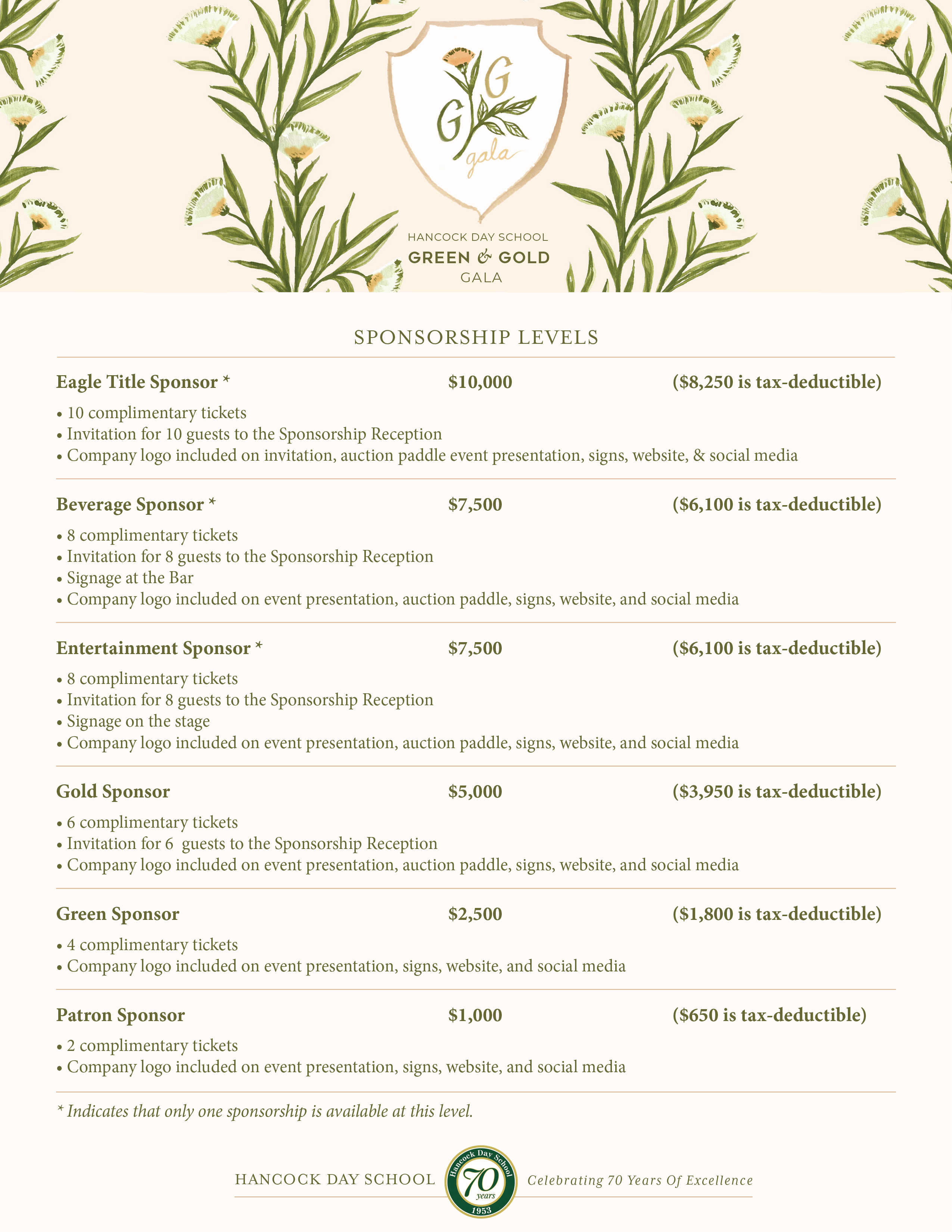 - Venmo (@hancockdayschool) with reference to Gala Sponsorship